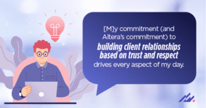 Finally, my commitment (and Altera’s commitment) to building client relationships based on trust and respect drives every aspect of my day. Communication is key. In fact, one of the Altera core values is “Bad news doesn’t get better with time.” In other words, it’s better to be upfront and direct. I encourage my team to be honest with clients when they’ve missed a deadline and to take responsibility for mistakes when they are made. I also recently segmented the client support team into regions that assign specific clients to specific support specialists. By focusing on a particular group of clients, our specialists will be able to get to know the clients on a more personal level and devote more time to their particular issues and concerns.